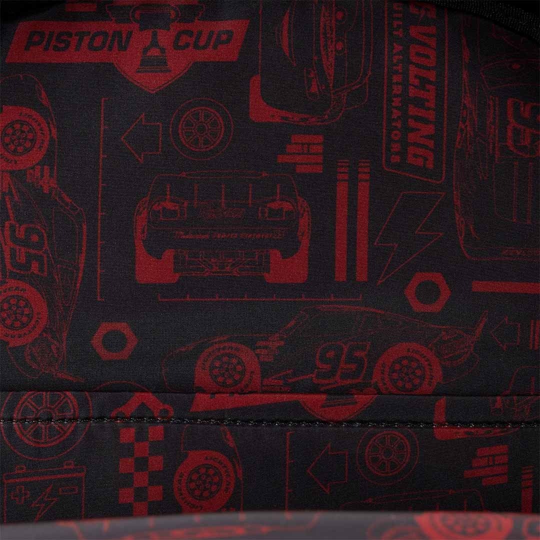 This full-size backpack features various images of Cars characters in white against a black background. The front pocket is shaped like a tire that says "Lightyear" on the side, and there are molded metal rivets in the center! The straps are half-white, half-red, and feature an applique of the number "95".