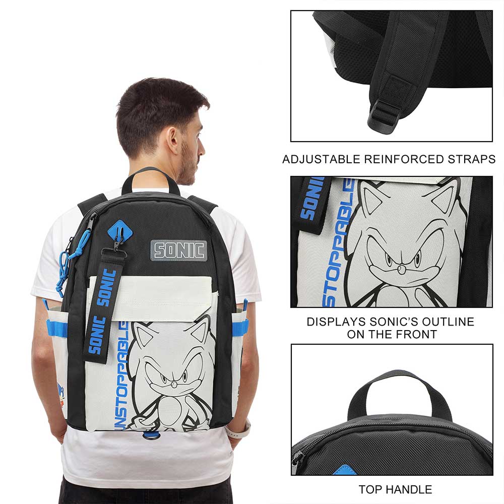 Zoom into action with this Sonic the Hedgehog backpack, featuring an outline of Sonic on the front pocket and images of Sonic with “Let’s Roll” text on the sides. Perfect for fans of the iconic character, this bag includes an interior laf???????????????????rts THEN '