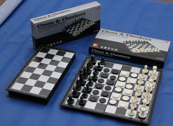 Two in one Chess and Checkers set.Uses High-Quality plastic mold which makes very nice quality chess&checkers piece and plastic box.The Travel Chess Set is a fun little set that easily fits in a pocket. It has a snap-closed plastic box with plastic hinges that opens up to a 345mm x 345mm board and 40mm black and white squares. The 3 dimensional pieces stay put with magnetic bases that keep them firmly planted on the board no matter where you travel. The King 80mm tall and all of the pieces are very visible and easy to play with.