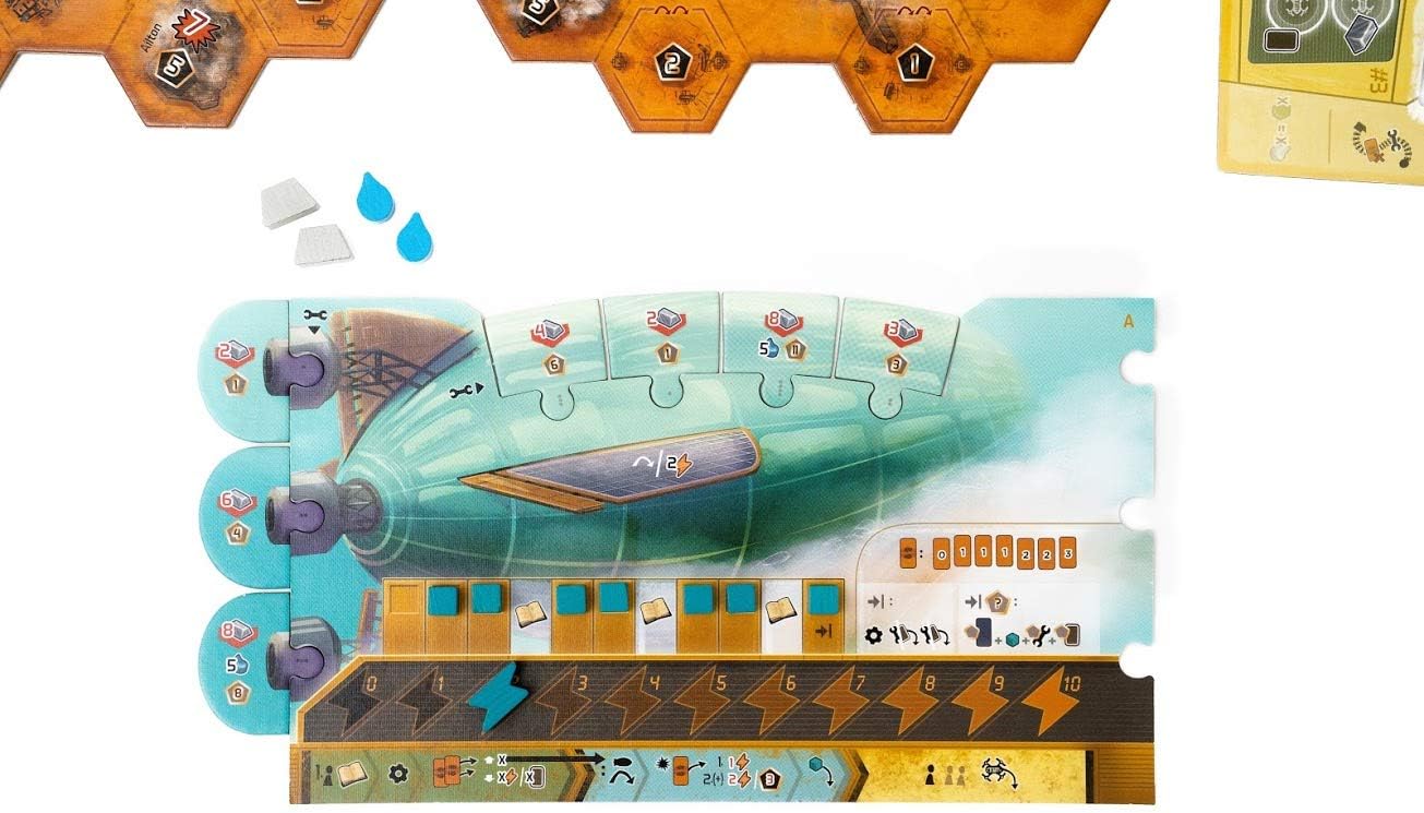 An innovative card-sleeving system makes possible a new, more immersive, form of resource gathering. Players try to predict which cloud-covered terrain will contain the desired amount of resources, or where additional actions are possible. Resources allow players to develop useful upgrades for their airships, or attract new crew members.