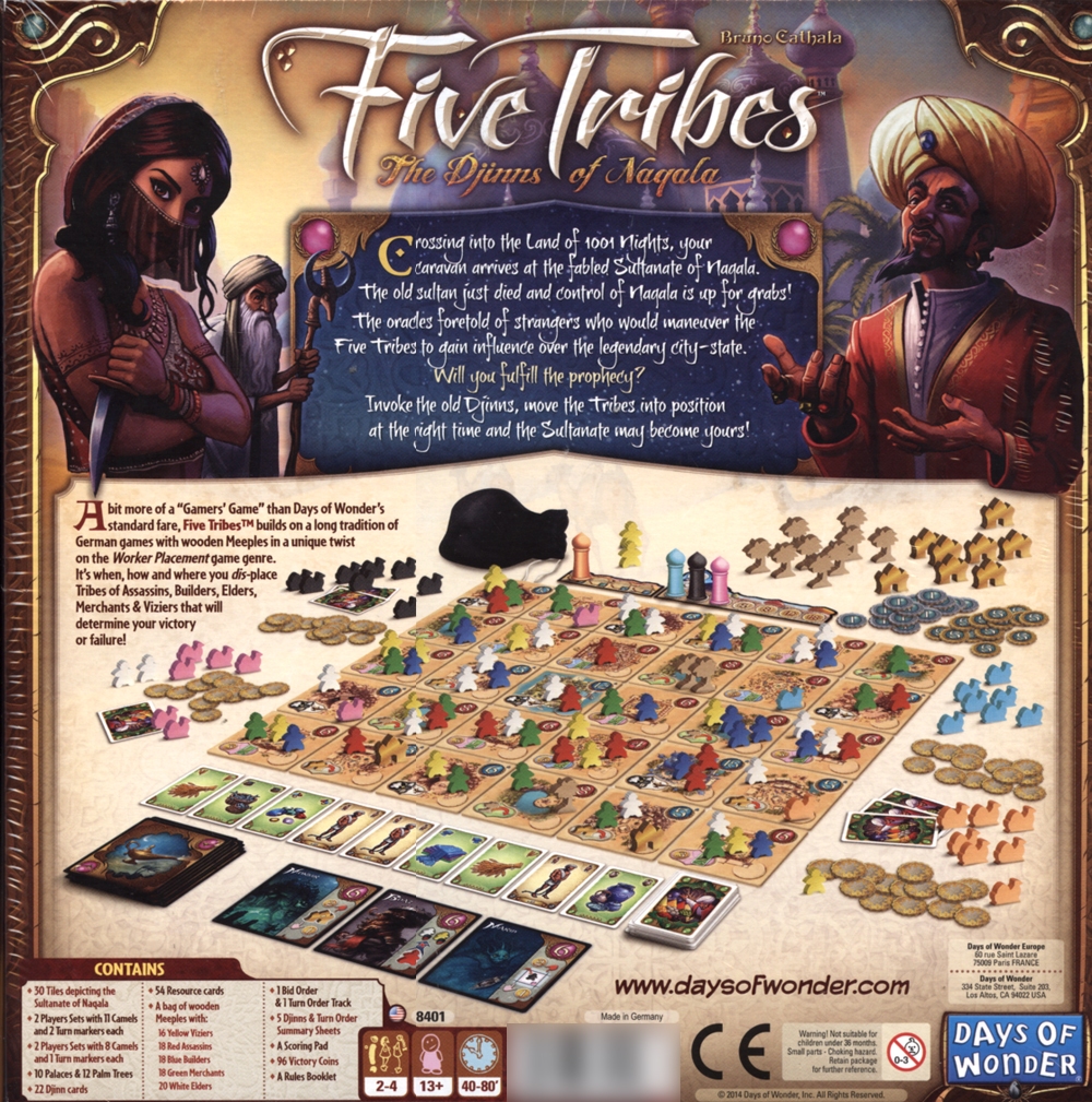 In a unique twist on the now-standard "worker placement" genre, the game begins with the meeples already in place – and players must cleverly maneuver them over the villages, markets, oases, and sacred places tiles that make up Naqala. How, when, and where you dis-place these Five Tribes of Assassins, Elders, Builders, Merchants, and Viziers determine your victory or failure.