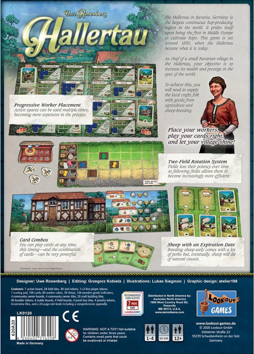 Hallertau is an expert worker placement game with six rounds, during which you'll need to harvest and make the most of the resources needed to develop your rural community. You'll need to think of everything: managing your fields and a multitude of different grains and other resources, improving your specialized buildings, aging your sheep, developing your worker force, and, of course, getting as many points as possible before the sixth round ends!