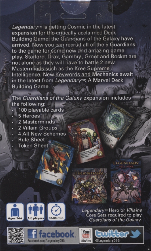 Legendary is getting cosmic in the latest expansion for the critically acclaimes Deck Building Game: the Guardians of the Galaxy have arrived. Now you can recruit all of the 5 Guardians to thegame for some new and amazing game play. Starlord, Drax, Gamora, Groot and Rocket are not alone as they will have to battle 2 new Masterminds such as the Kree Supreme Intelligence. New Keywords and Mechanics await in the latest from Legendary: A Marvel Deck Building Game.