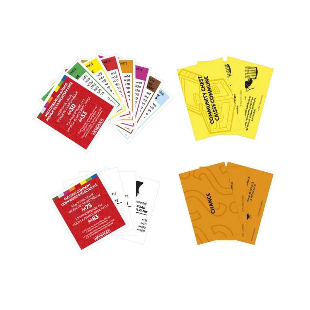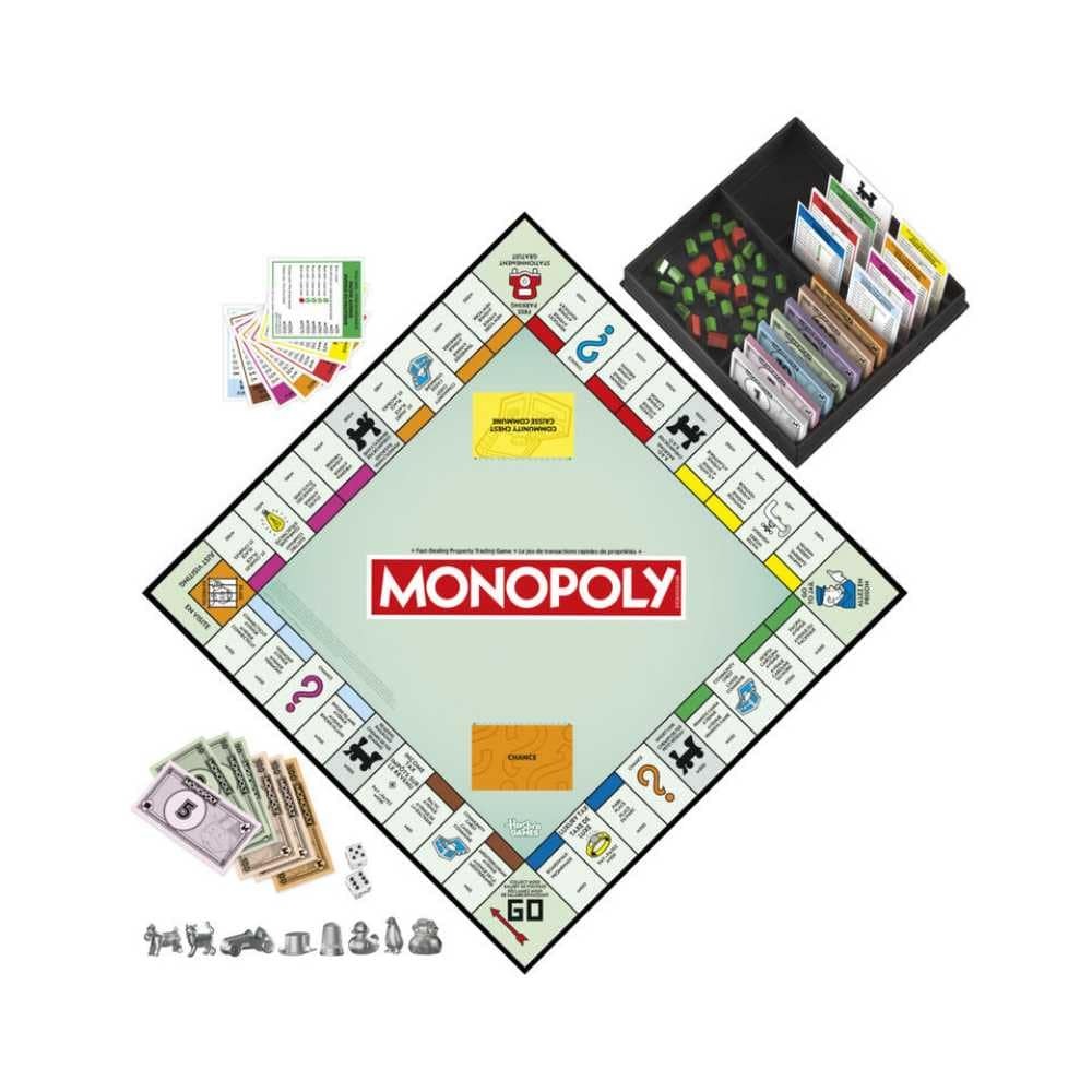 Includes: a game board, 8 pawns, 28 title deeds, 16 Chance cards, 16 Community Chest cards, 32 houses, 12 hotels, 2 dice, a money pack and the rules of the game.
