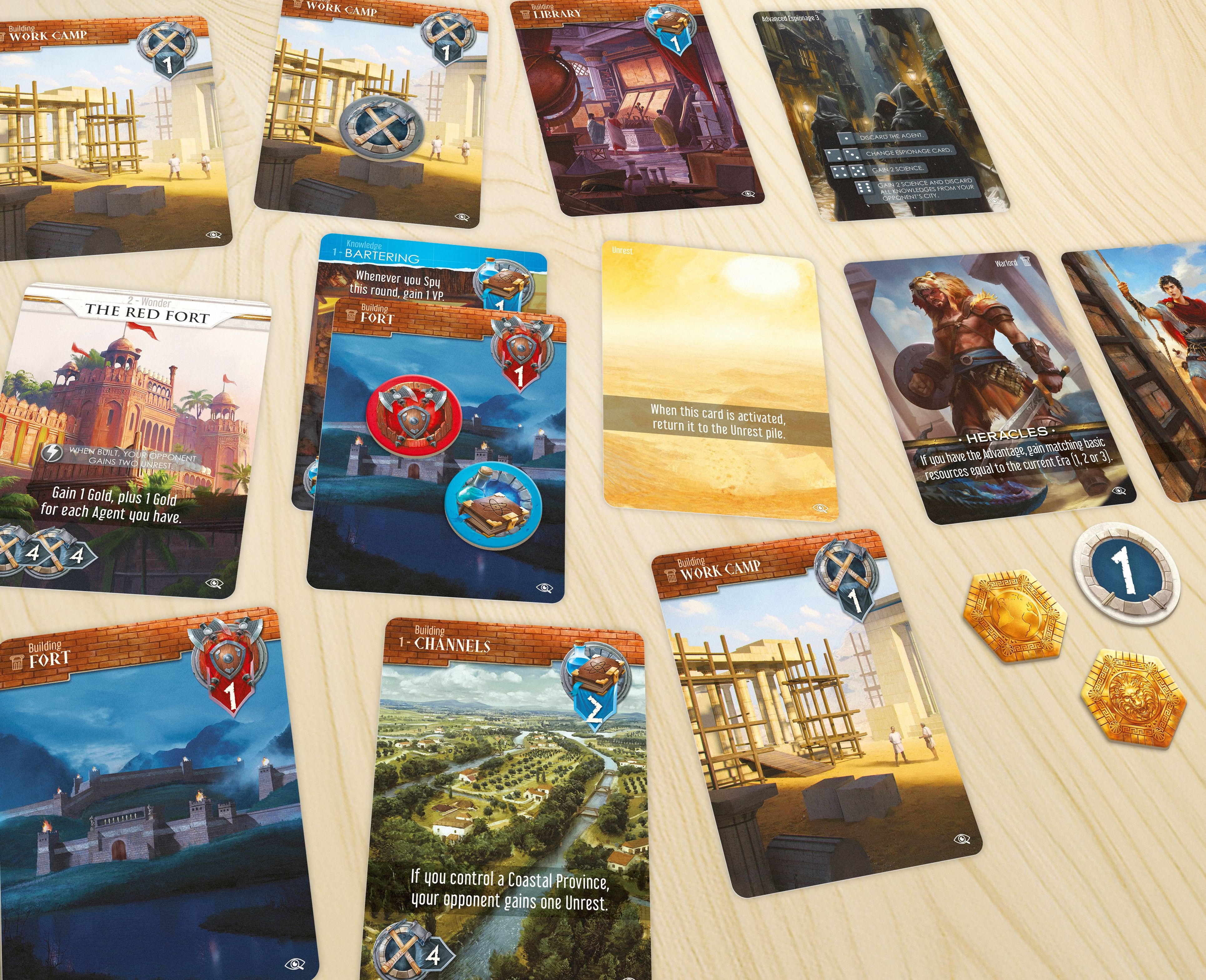 Espionage Box: Aksum, Greece, Aztec - Act in the shadows, forming and deploying your spies to sow chaos in your opponent's city. Witness their downfall as you acquire wealth and resources! A deckbuilding game where each civilization can be played with any other box, where the gameplay of each box can be combined with the other two, offering a very high replay value!