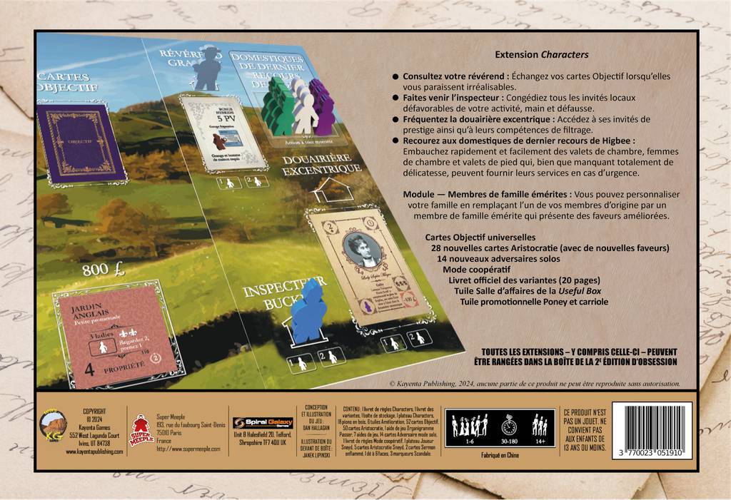 L'extension Personnages d'Obsession introduit de nouvelles personnalités thématiques dans le Derbyshire, offrant des actions uniques pour gérer votre domaine rural : l'agent Bucket, habile à chasser toutes sortes d'invités peu recommandables ; un M. Higbee capable de trouver une aide ménagère en cas de besoin (« Des références ? Je suis sûr qu'elles sont quelque part… ») ; le sage révérend Grantly, dispensateur de sages conseils ; et une marquise douairière excentrique, qui vous mettra en contact avec un major prussien, un noble suédois et un comte russe en un clin d'œil.