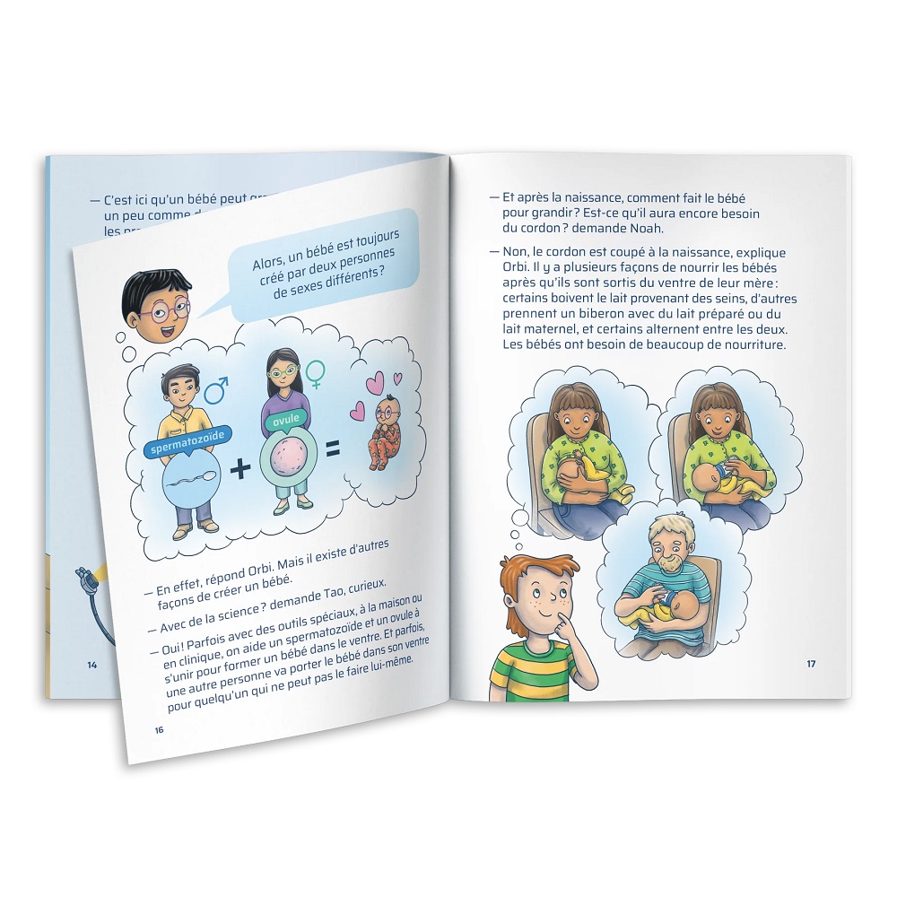 Lorsque l'enfant demande pour la première fois d'où viennent les bébés, le parent peut lui répondre de façon simple et vraie. Par exemple, il pourrait lui dire : «Les bébés se forment lorsqu'un spermatozoïde rencontre un ovule. Ensemble, ils commencent à créer un bébé.» Si l'enfant pose d'autres questions, cela signifie qu'il est probablement prêt à en savoir plus. C'est le moment idéal pour jouer à Houston, comment on fait les bébés? et l'accompagner dans sa découverte du sujet. Le jeu permet d'aborder ces questions dans un cadre détendu et amusant, en favorisant un dialogue ouvert et naturel. Les notions y sont présentées de façon concrète et accessible en utilisant un langage et des illustrations adaptés aux enfants. Le jeu les aide ainsi à mieux comprendre les étapes de la reproduction. Il offre aussi l'occasion à l'enfant de découvrir que les réalités familiales sont multiples et que les familles se composent de différentes façons.