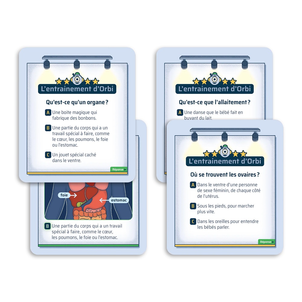 • Les cartes «L'entrainement d'Orbi» permettent aux joueurs de consolider les apprentissages de l'album grâce à des questions à choix de réponses amusants.