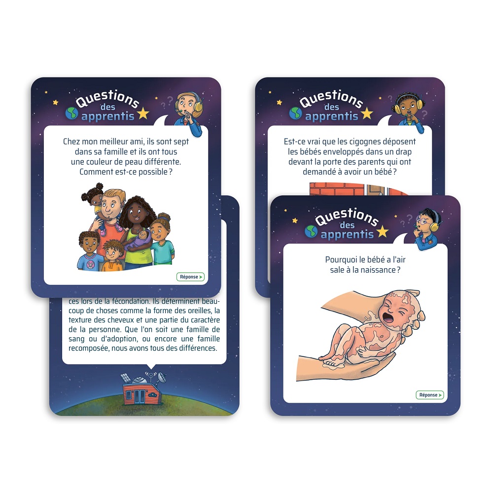 • Les cartes «Questions des apprentis» invitent les joueurs à répondre aux interrogations que les enfants peuvent avoir au sujet de la reproduction, de la grossesse et de la naissance.