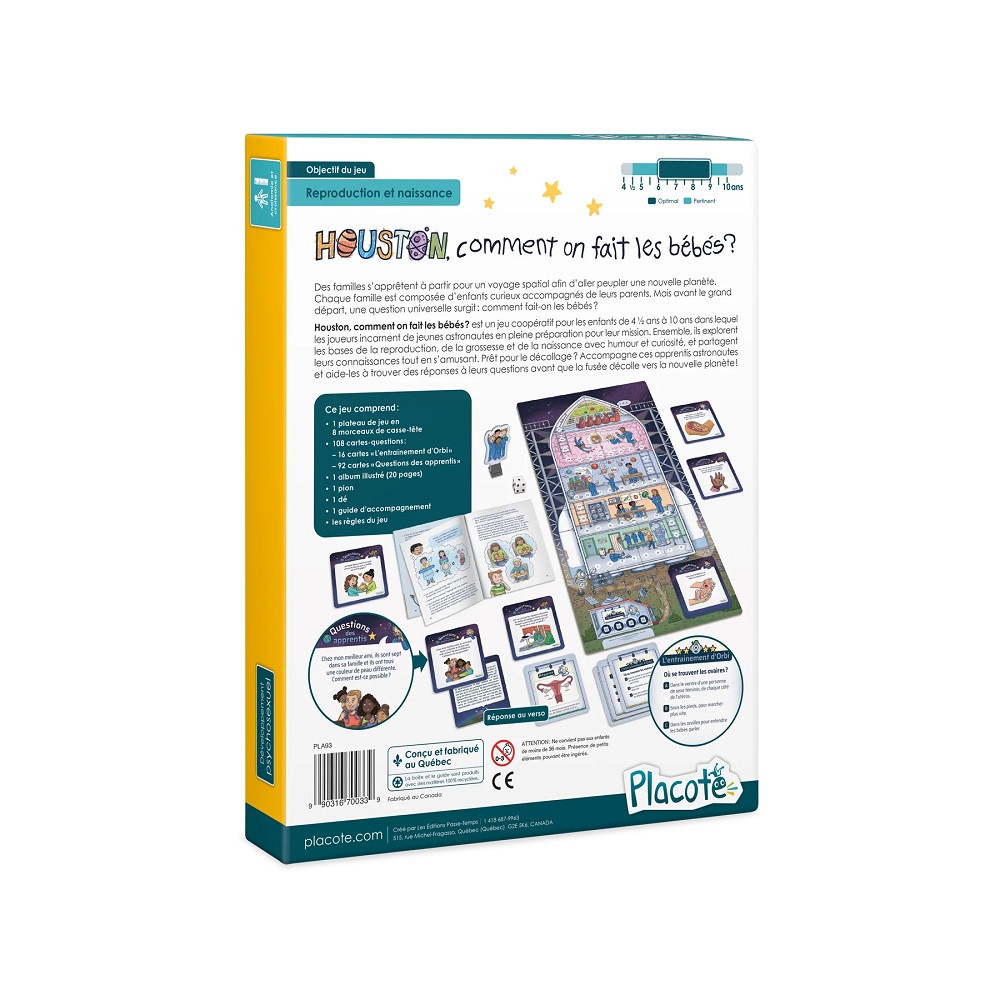 Houston, comment on fait les bébés? est un jeu coopératif pour les enfants de 4½ ans à 10 ans dans lequel les joueurs incarnent de jeunes astronautes en pleine préparation pour leur mission. Ensemble, ils explorent les bases de la reproduction, de la grossesse et de la naissance avec humour et curiosité, et partagent leurs connaissances tout en s'amusant. Prêt pour le décollage? Accompagne ces apprentis astronautes et aide-les à trouver des réponses à leurs questions avant que la fusée décolle vers la nouvelle planète!