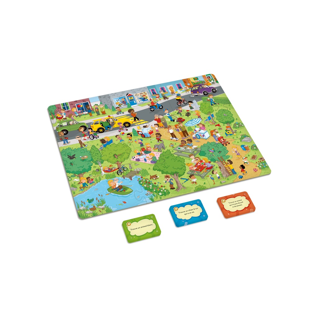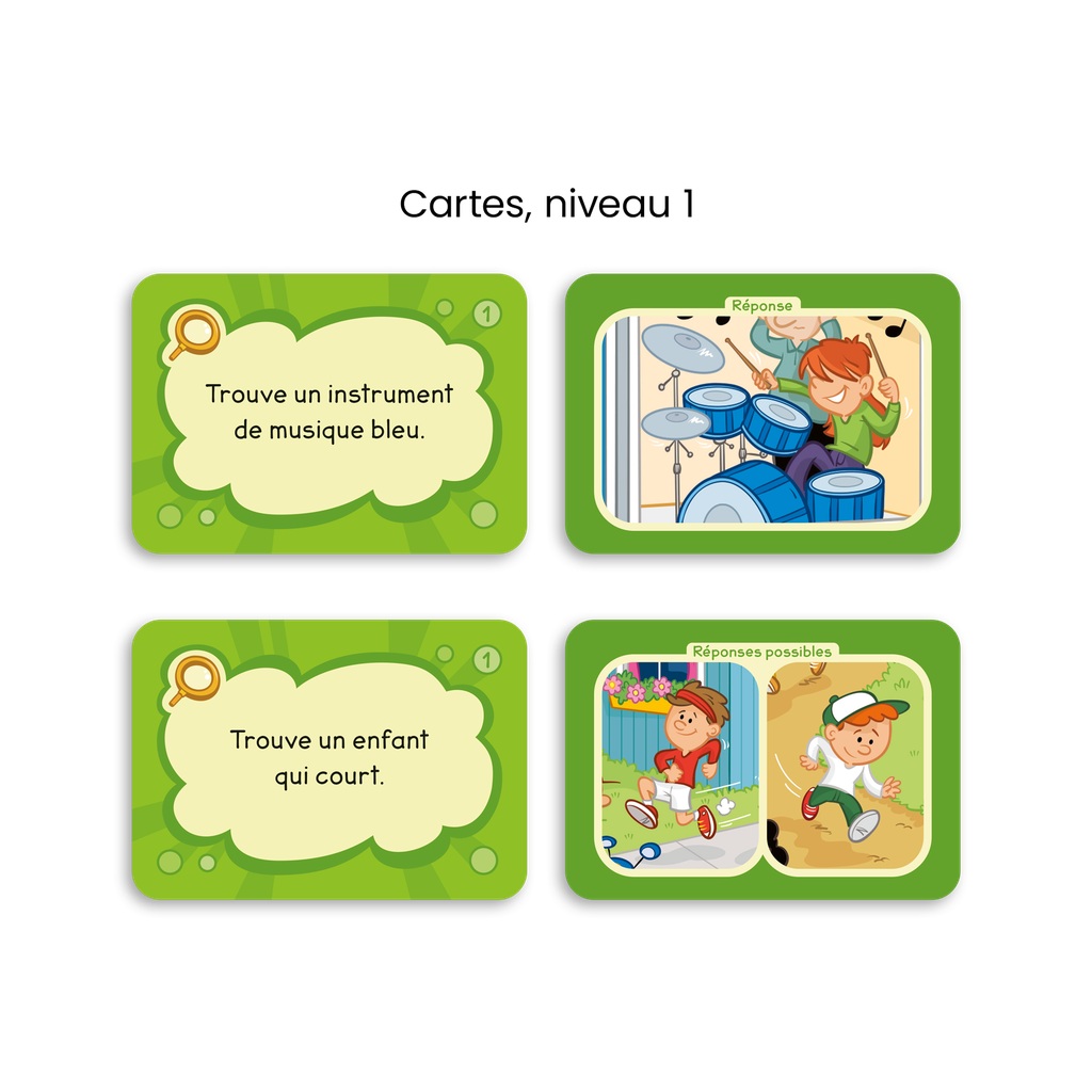 Description : Que le meilleur trouve! est un jeu conçu pour solliciter les habiletés de compréhension de consignes et de catégorisation des enfants de 3 ans à 7 ans. Les enfants écoutent des consignes faisant intervenir différentes catégories (moyens de transport, instruments de musique, personnes, objets, etc.) et tentent d’être le joueur le plus rapide à repérer des éléments dans une scène illustrée. Le jeu comprend trois niveaux de difficulté proposant des consignes de plus en plus longues et complexes.