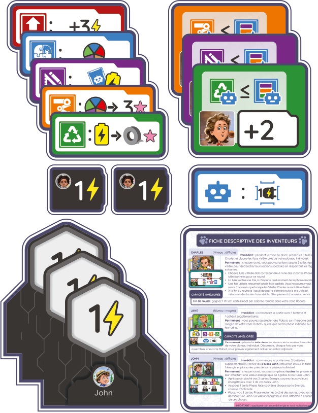 | Une extension qui apporte d'autres inventeurs au jeu de base, des nouveaux robots et un concept d'activation adjacente. Les cartes sont bien identifiées si jamais il y avait un besoin de les séparer du jeu de base. | |