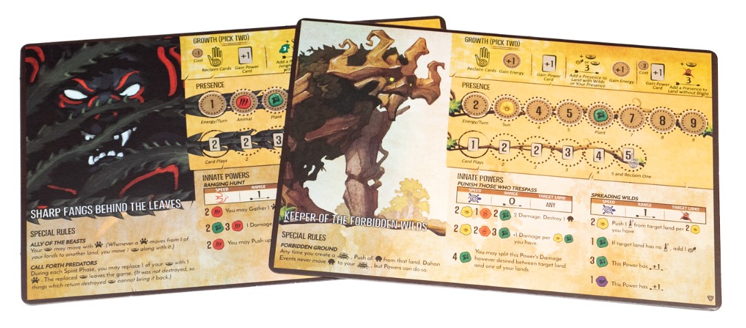 All the same Spirit information, but with intricate foiled art on high-quality cardstock. Shine as you grow, expand, and save your island. The Spirits Sharp Fangs Behind the Leaves and Keeper of the Forbidden Wilds are included in this set.