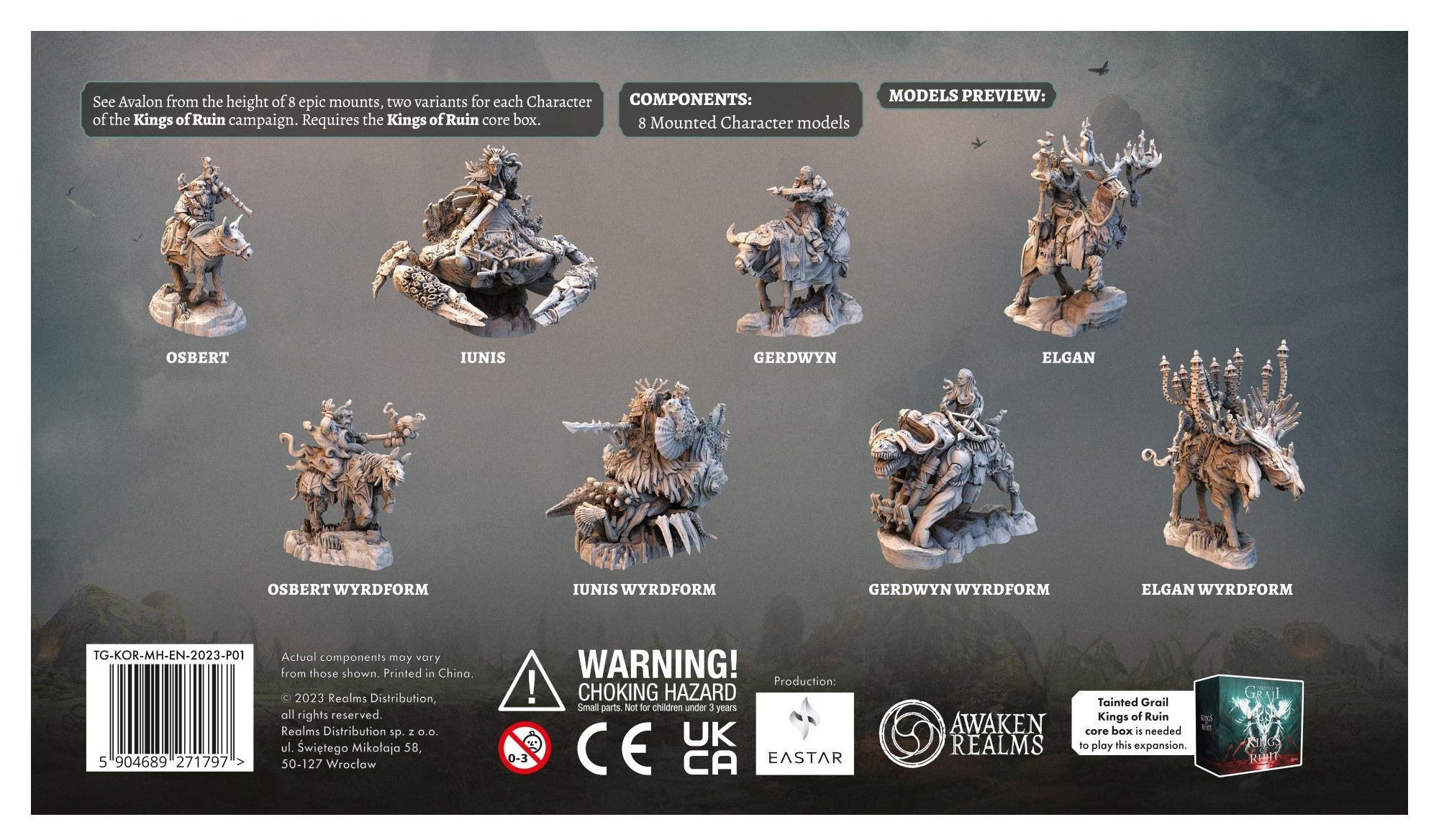 This cosmetic Tainted Grail: Kings of Ruin add-on introduces 8 mounted character models, two variants for each hero of the campaign (one standard version and one Wyrdform version). Requires Kings of Ruin Core Box.