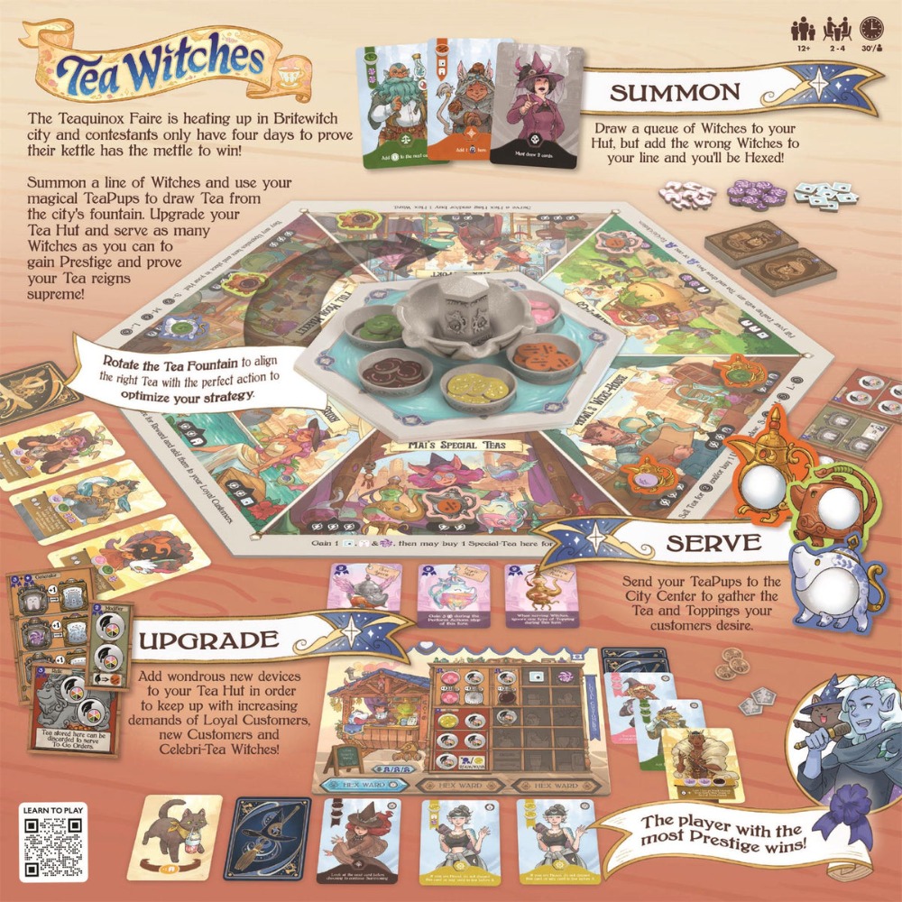 In the service phase, players take turns sending their adorable TeaPups to various Bootiques in the city to gather toppings and collect tea from the rotating crystal fountain in order to serve witches waiting at their hut. Additionally, TeaPups can help players collect powerful upgrades, attract Celebri-teas, and brew up Special-Teas with bonus abilities. Clever TeaPup placement can also help you complete to-go orders for witches out and about in the city center.