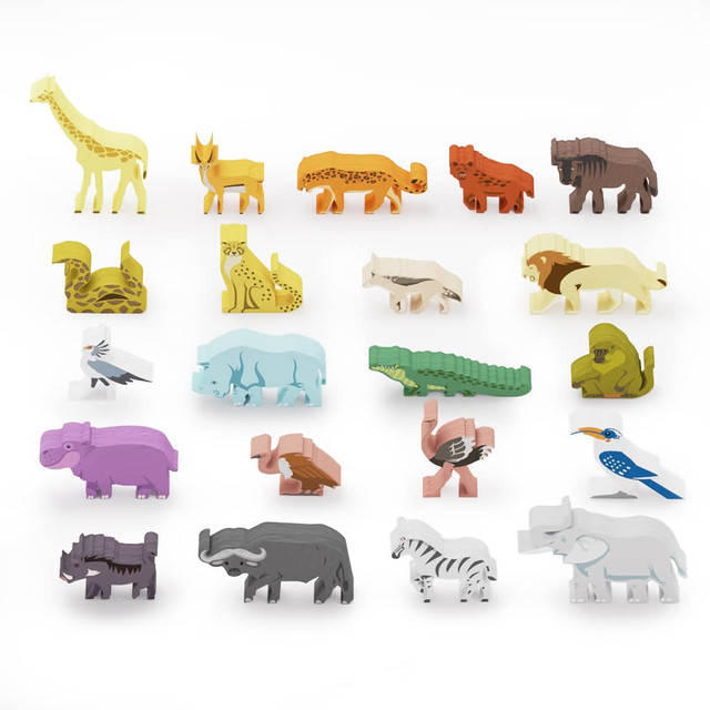 - Includes: A Lion, Hornbill, Zebra, Hyena, Gazelle, Jackal, Wildebeest, Leopard, Rhinoceros, Crocodile, Elephant, Vulture, Giraffe, Hippo, Warthog, Cheetah, Secretary Bird, Ostrich, Monkey, Buffalo, and Python.