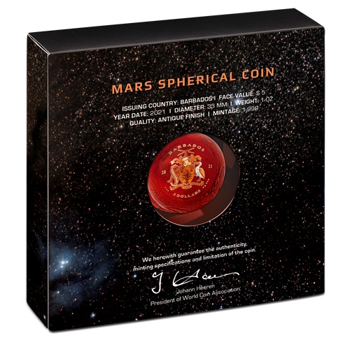2021 BARBADOS COINS - 1 OZ. PURE SILVER SPHERICAL COIN - MARS