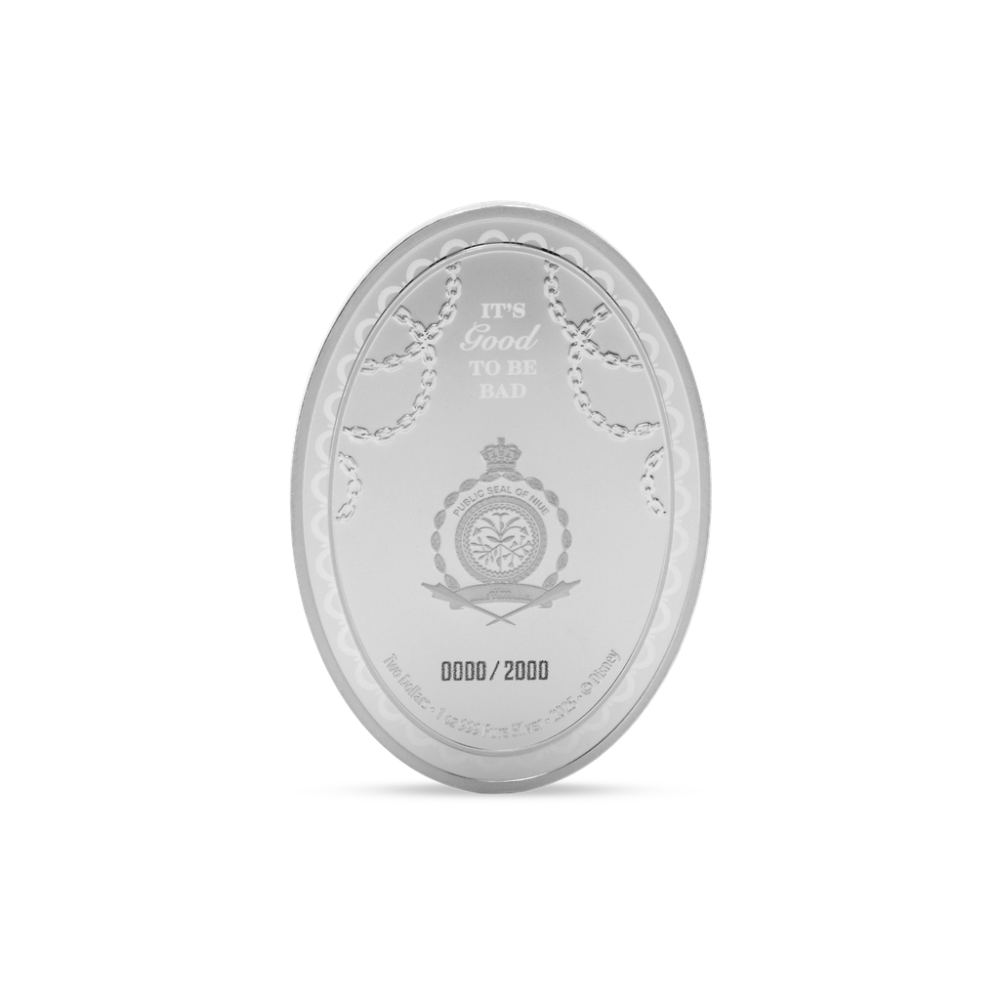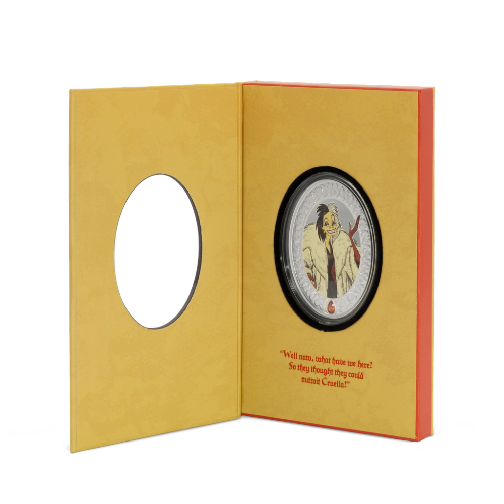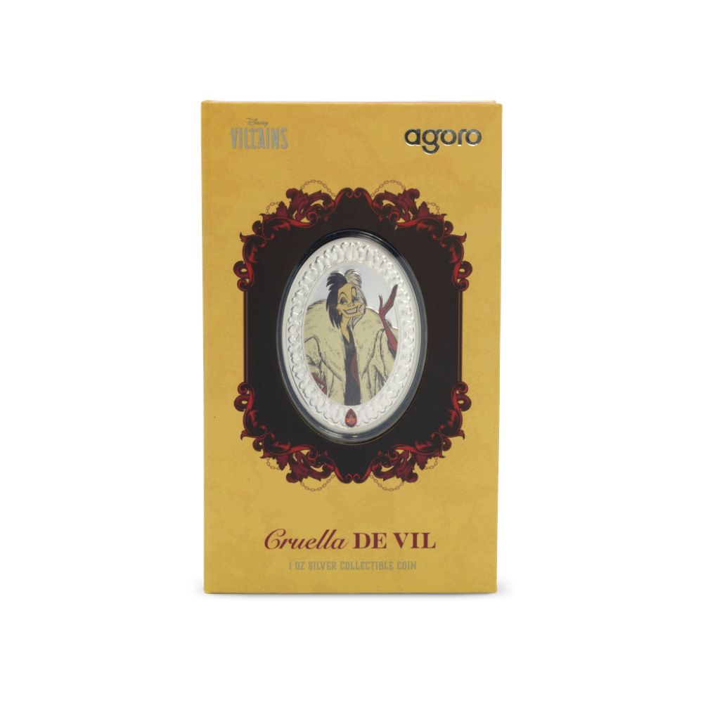 Disney’s most devilish fashionista, Cruella De Vil, is here, captured in 1oz of 999 pure silver. Her sharp features, striking black-and-white hair, and fiery red attire are brought to life in vivid color and proof detail.