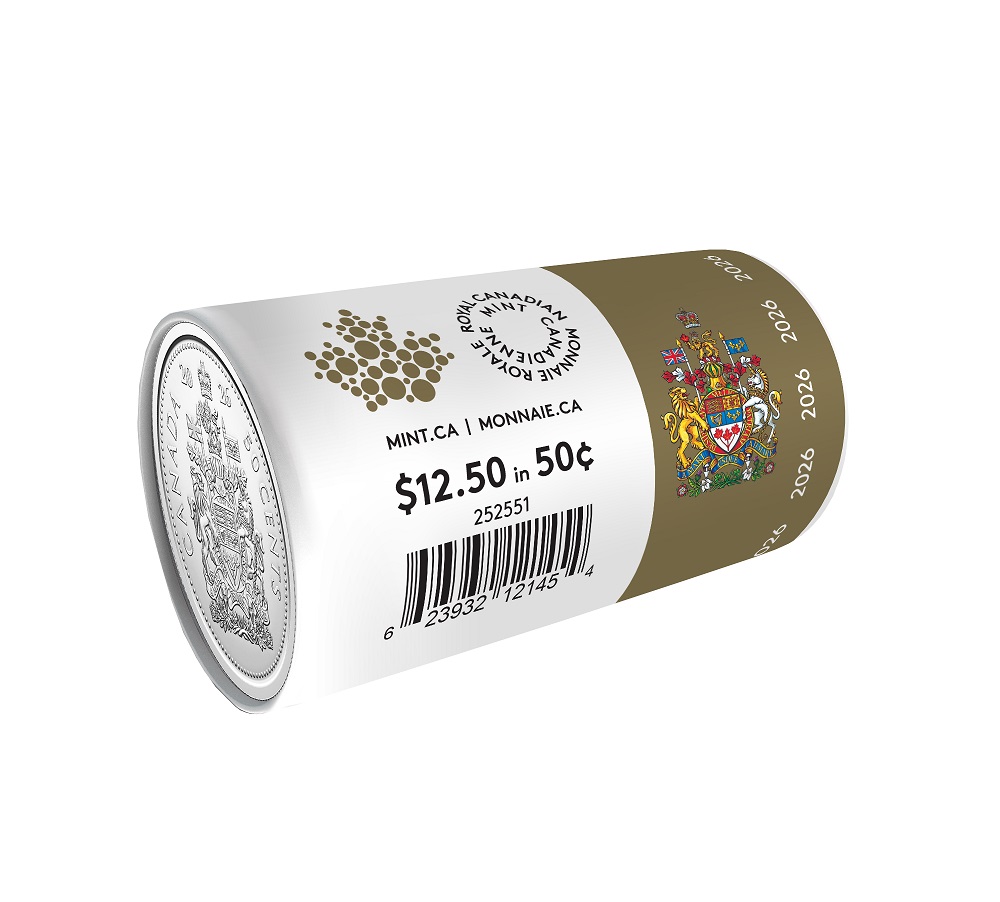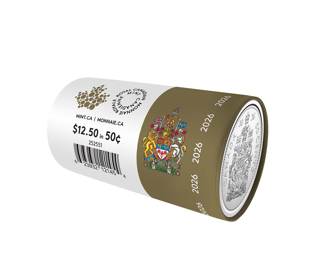 From the Royal Canadian Mint—Canada’s 50-cent coin rarely pops up in pocket change, but with a Special Wrap Roll, any collection can be instantly updated to include the 2026 edition. Each Special Wrap Roll consists of 25 uncirculated 50-cent coins wrapped in an illustrated paper that complements the heraldic design elegantly etched onto each coin’s reverse.