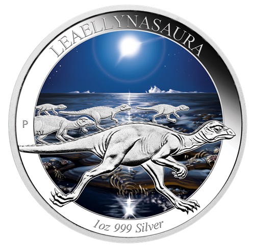 Crafted from a troy ounce of 99.9% pure silver, the fully struck-up depiction of Leaellynasaura contrasts beautifully with the starlit prehistoric scene.