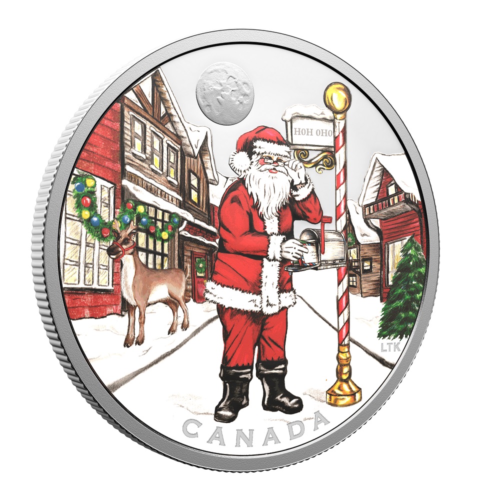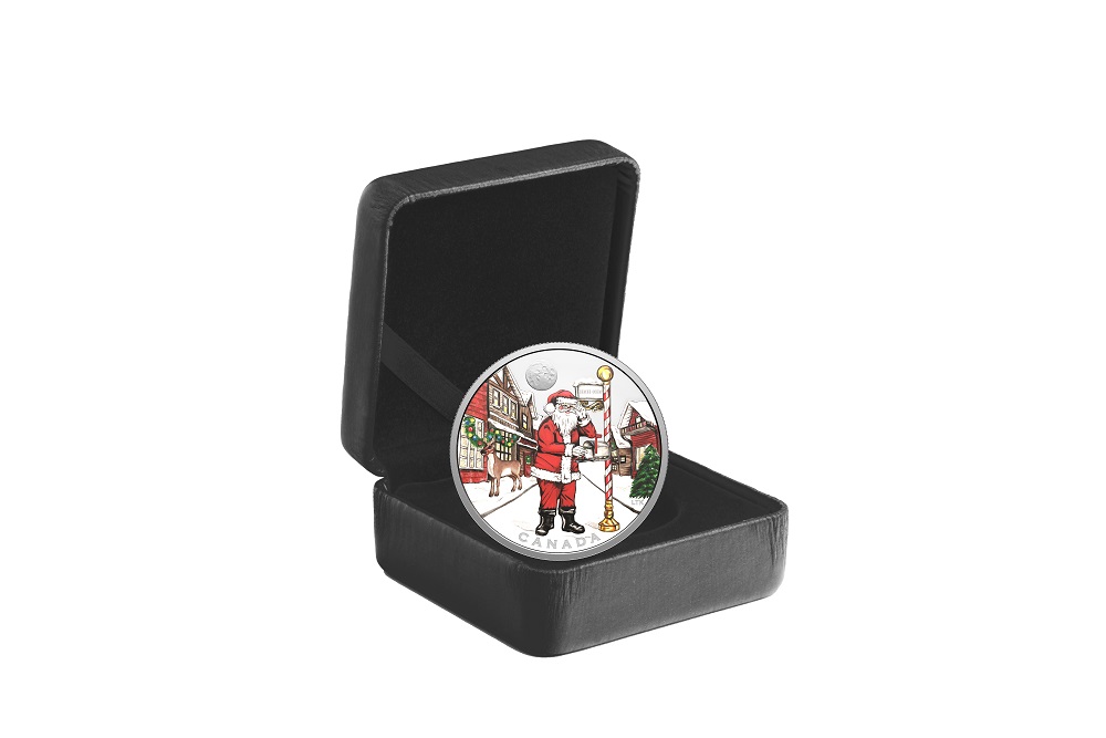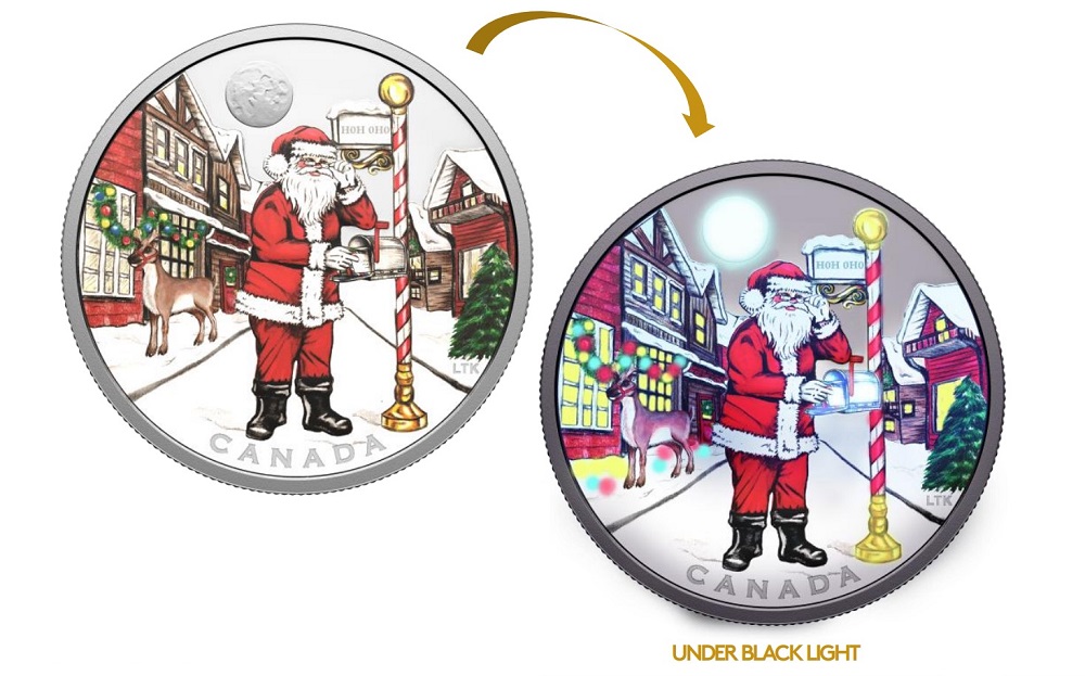 Santa Claus is coming to town, and while the elves are busy with toymaking, he himself is working day and night to keep up with all the letters that are pouring in! From the Royal Canadian Mint, this 99.99% pure silver coin whisks you to the North Pole (postal code H0H 0H0) for a fun dose of holiday cheer and a sneak peek at Santa’s mail call. Accompanied by one of his magical reindeer, Santa is seen retrieving the latest batch of missives from his mailbox in this colourful nighttime scene, which turns magical when viewed under a black light (flashlight included) that unlocks a fun glow effect.