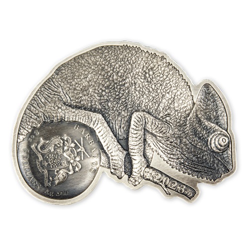 • In contrast, the obverse shows the embossed chameleon alongside the coat of arms of Barbados in pure silver.