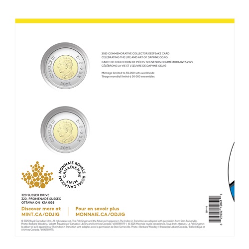 - New format. Redesigned in 2024 to keep the focus on the commemorative theme, each Commemorative Collector Keepsake Card contains two (2) uncirculated coins: a colourized $2 Celebrating the Life and Art of Daphne Odjig coin, and a non-colourized one.