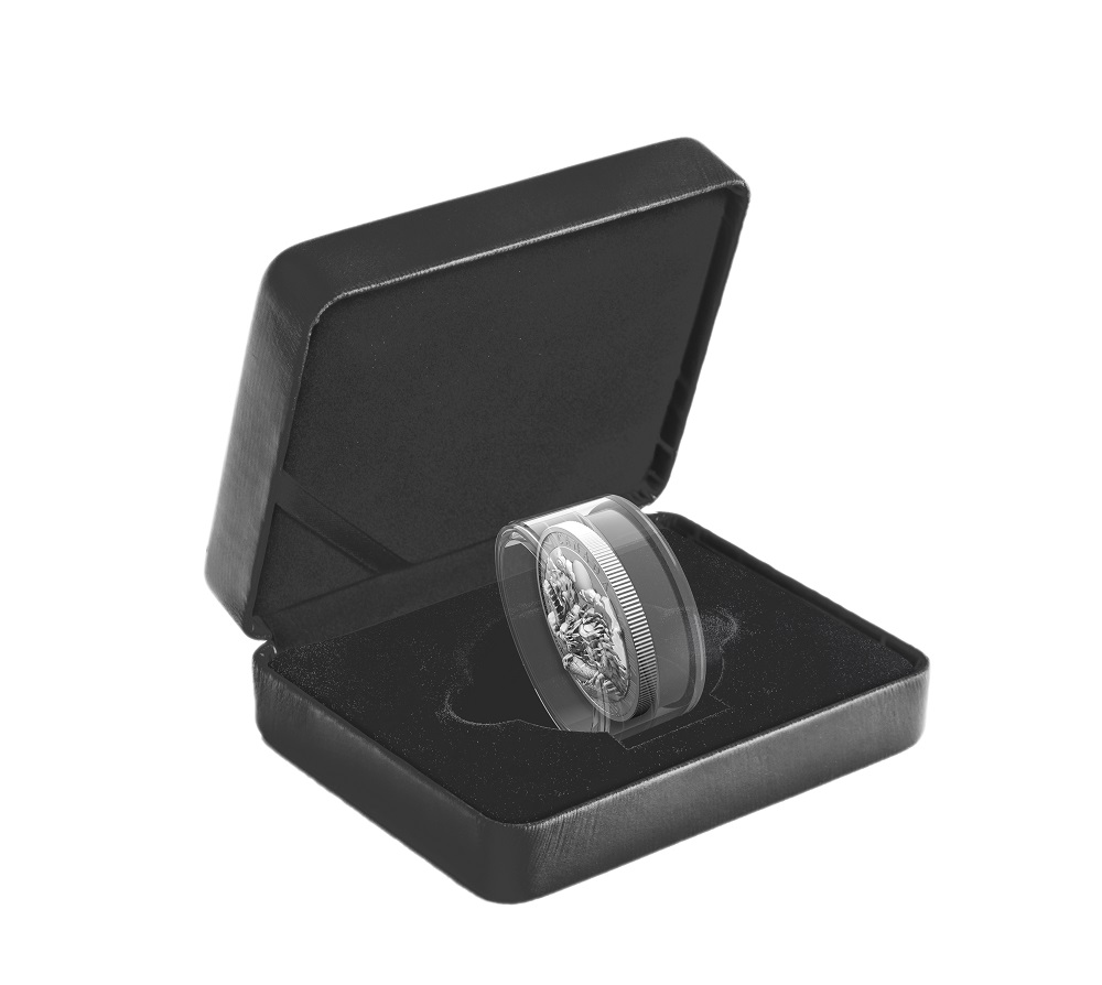 According to Chinese astrology, 2024 is the year of the Wood Dragon, bringing with it the promise of growth, progress, creativity and good fortune. Framed by a wood pattern on this coin, the powerful Dragon is brought to life by Extraordinarily High Relief (EHR) that lifts the finely detailed relief to an incredible height of 4.7 mm. The Mint’s R&D team went one step further, elevating the extraordinary by providing a rear view – also engraved in Extraordinarily High Relief – of that same scene on the coin’s obverse, where the relief climbs to 3.85 mm to give the Dragon a more three-dimensional form within this two-sided design.