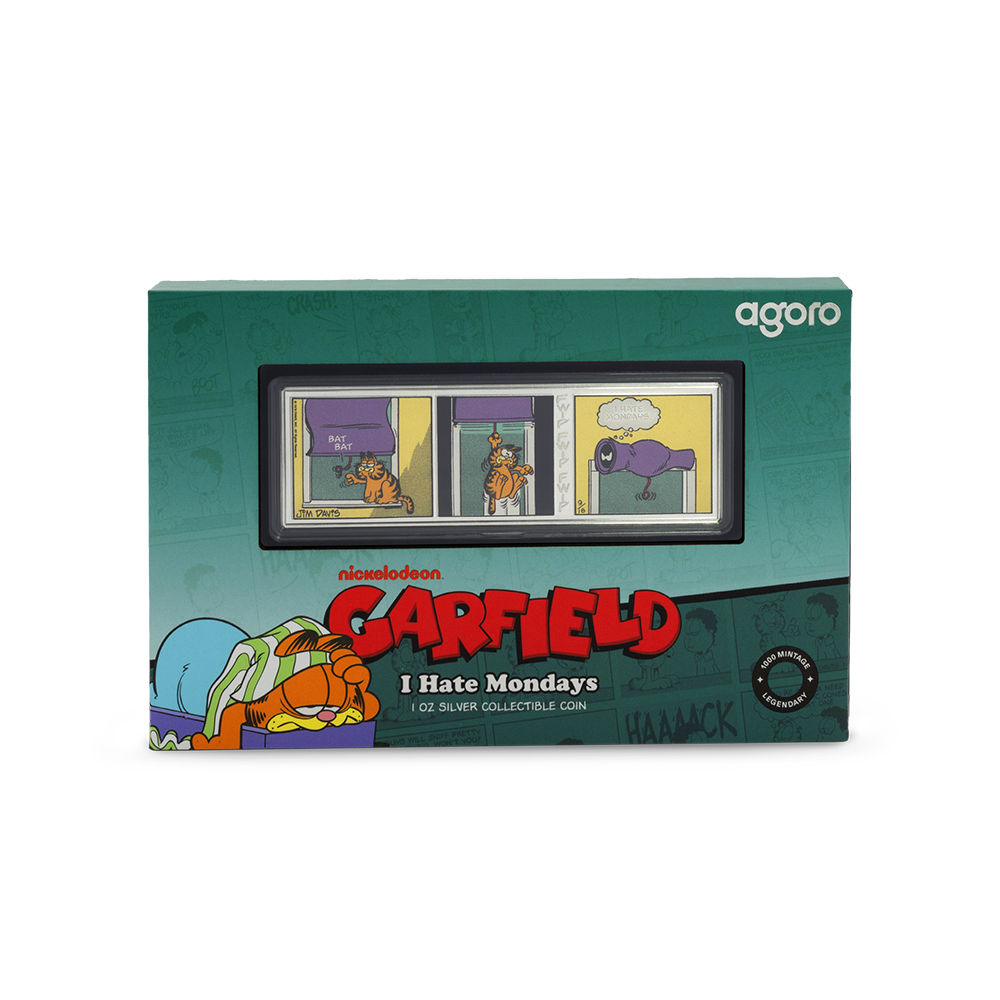 Each 1oz silver piece is struck from 999 fine silver, individually numbered, and presented in Garfield-themed packaging with a Mark of Authenticity.