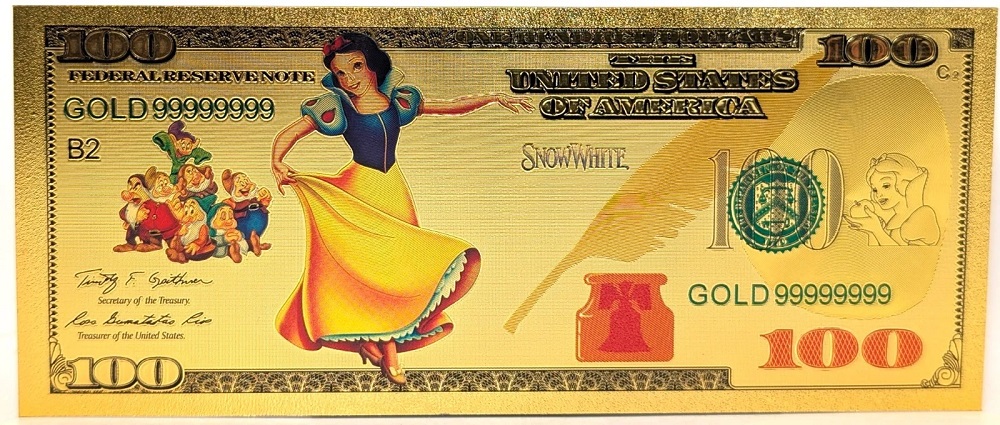 HUMORISTIC NOTES  -  DISNEY PRINCESSES: SNOW WHITE - UNITED STATES 100 DOLLARS NOTE (PURE GOLD PLATED)