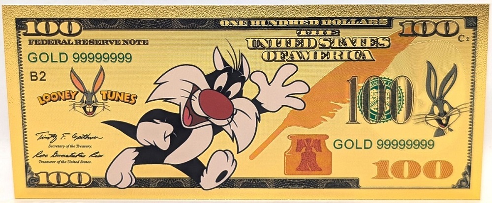 HUMORISTIC NOTES  -  LOONEY TUNES: SYLVESTER JUNIOR - UNITED STATES 100 DOLLARS NOTE (PURE GOLD PLATED)