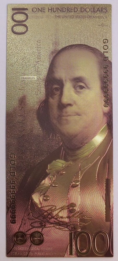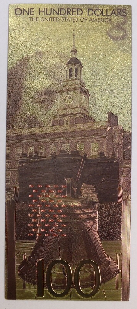 HUMORISTIC NOTES - UNITED STATES PRESIDENTS: BENJAMIN FRANKLIN (LIBERTY BELL) - UNITED STATES 100 DOLLARS NOTE (PURE GOLD PLATED)
