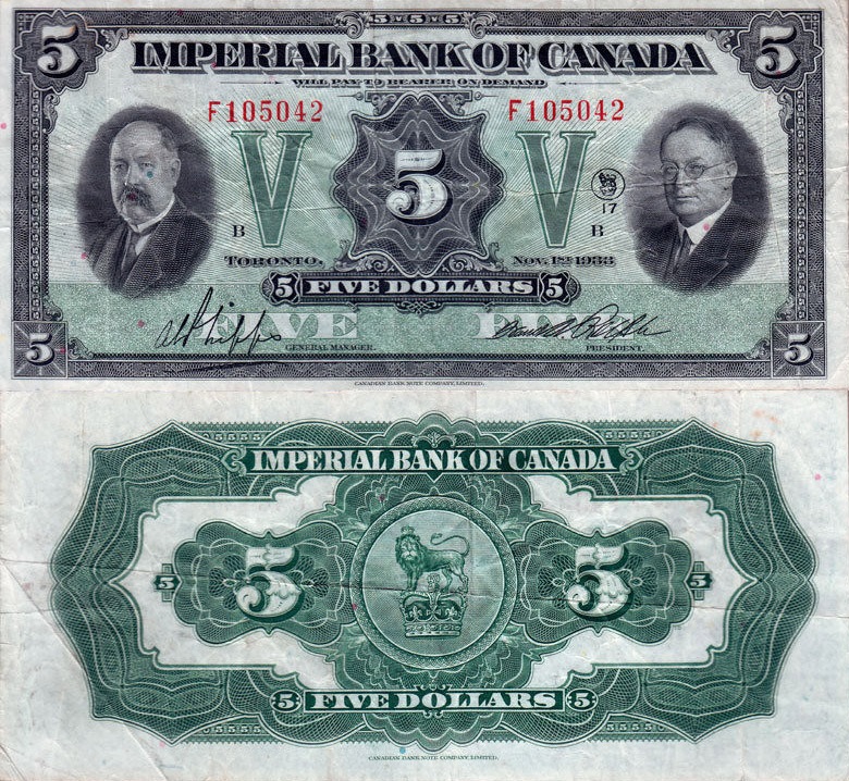 IMPERIAL BANK OF CANADA - 1933 CANADIAN BANKNOTES - 1933 5-DOLLAR NOTE (F)
