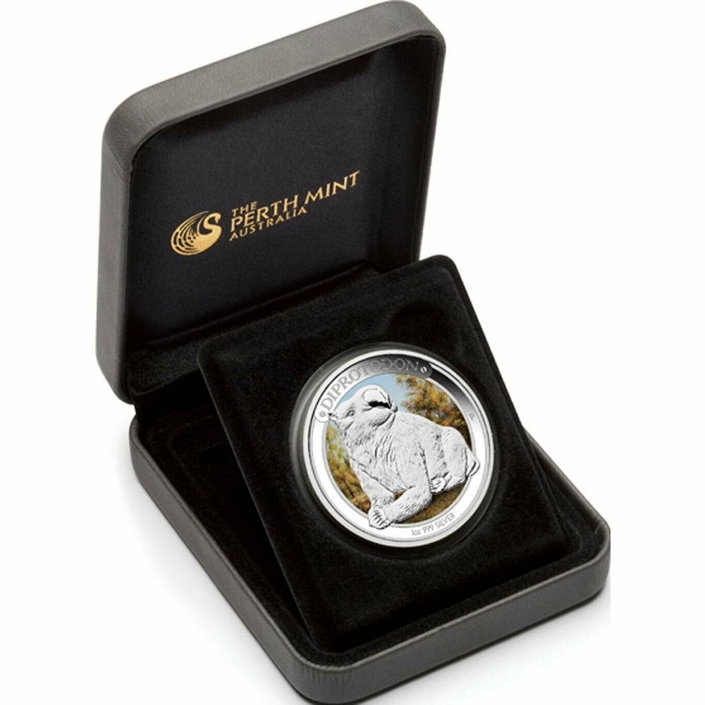 Coloured background with Diprotodon in silver, with name plaque above. Mint mark to the right and purity and weight at the bottom.