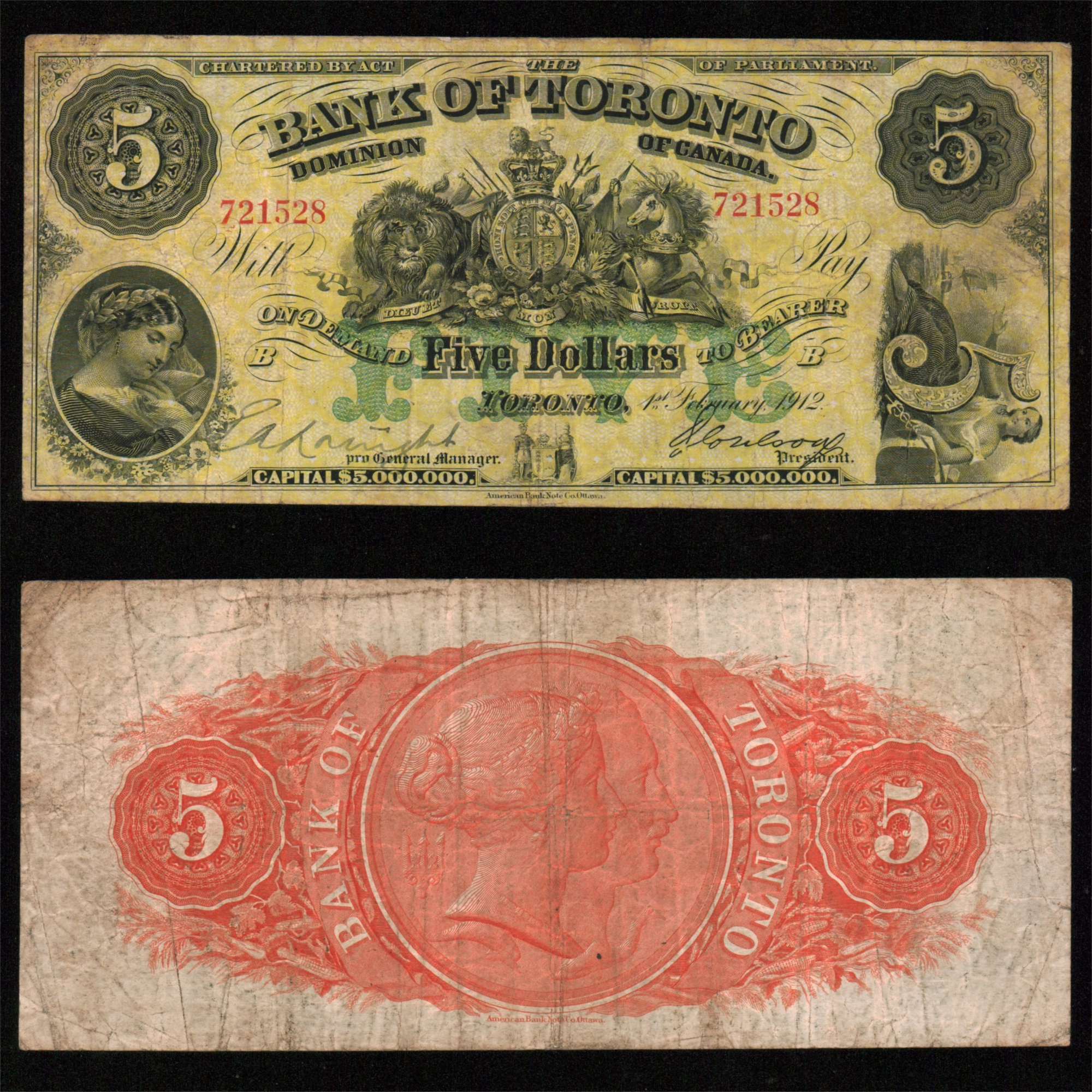 THE BANK OF TORONTO  -  1912 CANADIAN BANKNOTES  -  1912 5-DOLLAR NOTE (F)