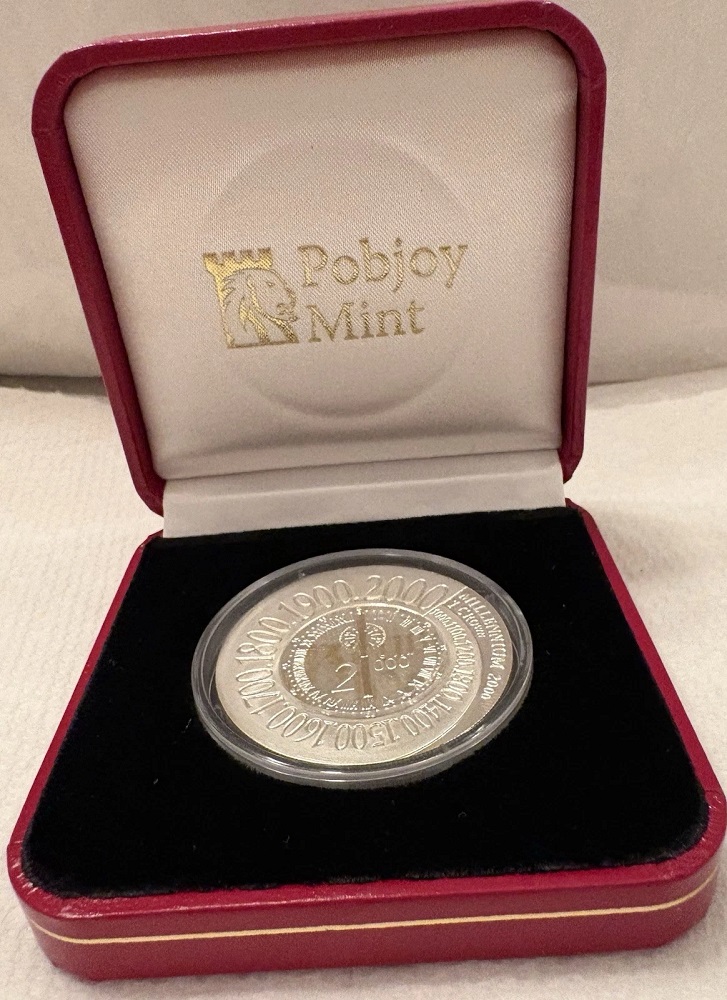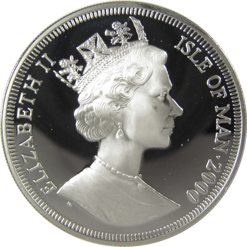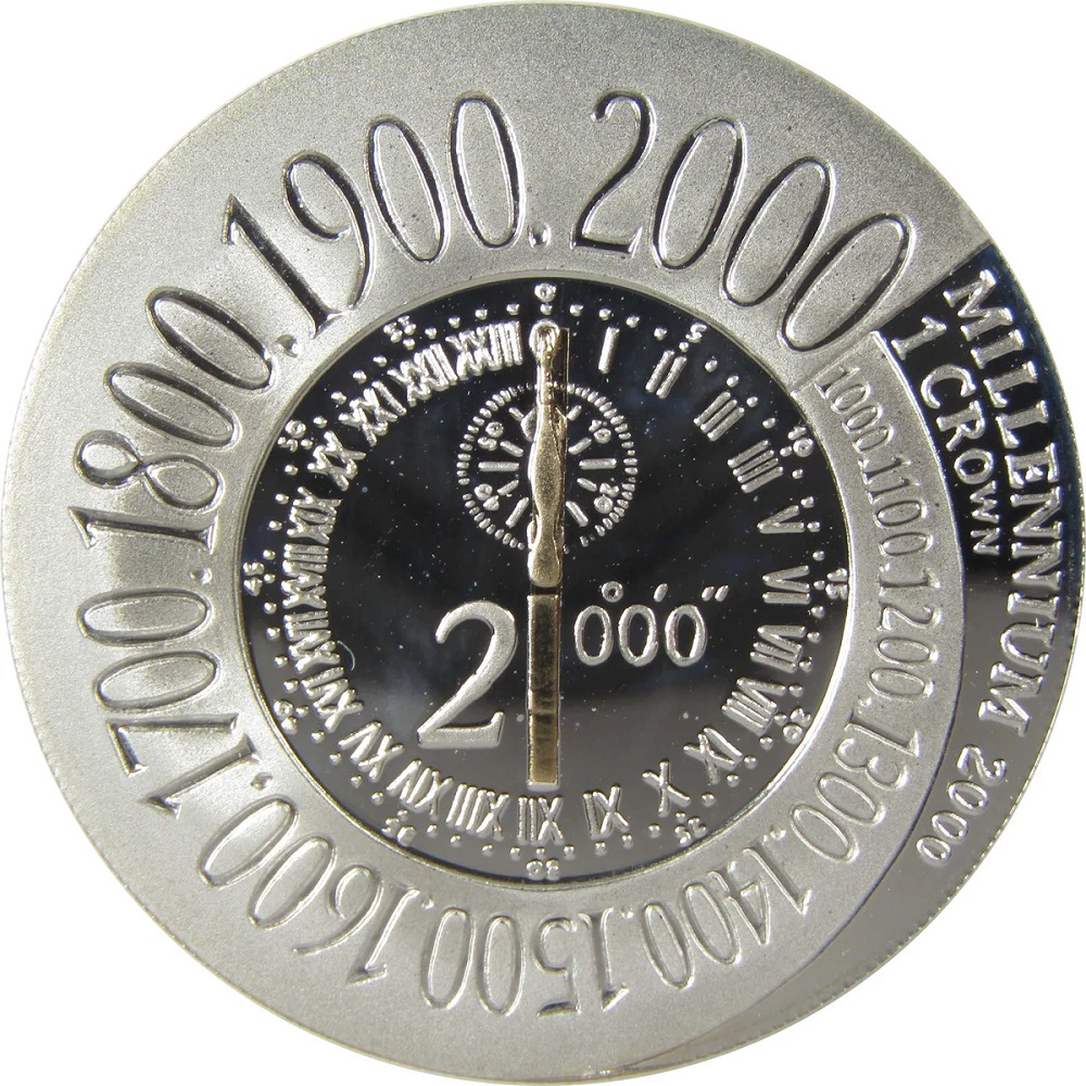 This gorgeous proof coin commemorates the Millennium and the Meridian Line that is the basis of Greenwich Mean Time, the time and date system of the world. The front shows the Old Royal Observatory Clock Face embedded with a brass strip from the Original Prime Meridian. In 1998, the physical brass strip was replaced with an electronic one in preparation for the new Millennium.