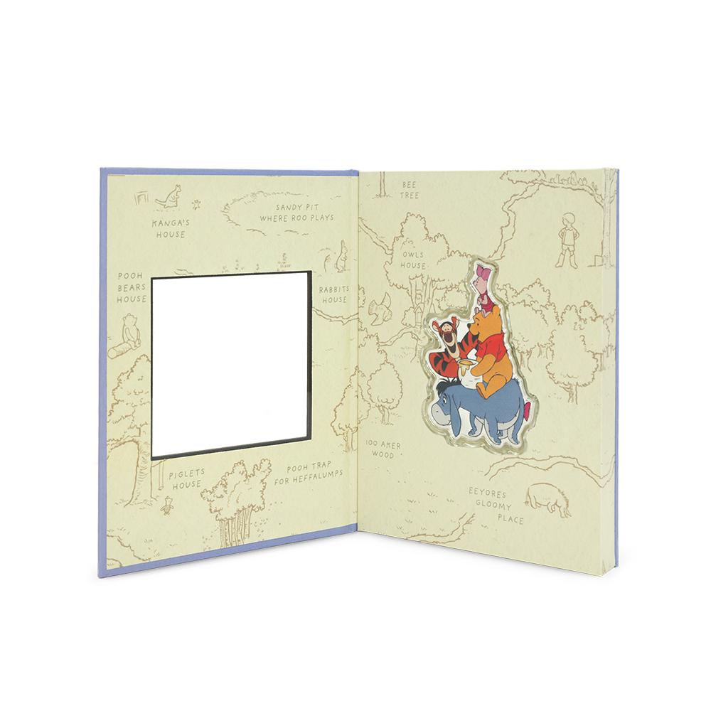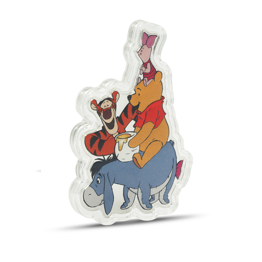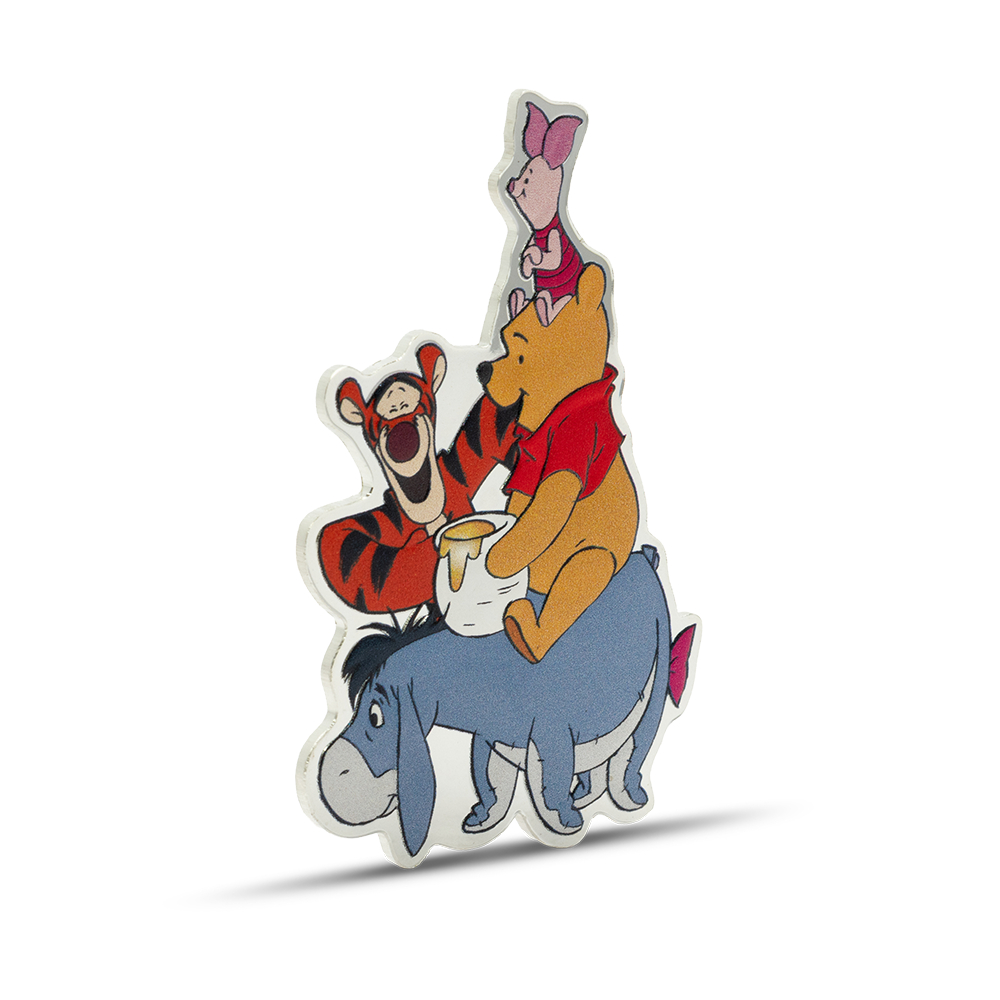 All of Disney’s Winnie the Pooh lovable charm is captured in 1oz of 999 pure silver. This shaped and colored collectible brings Winnie the Pooh and friends riding happily atop Eeyore, with Piglet perched on Pooh’s shoulders as they journey through the Hundred Acre Wood. As the second release in our series celebrating 100 years of Winnie the Pooh, it’s a heartwarming tribute, because honey is always better with friends.