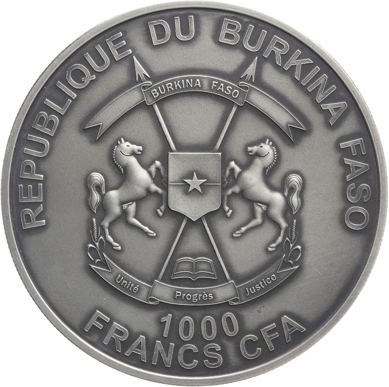 The obverse of the coin depicts the Coat of Arms of Burkina Faso and the inscriptions: "REPUBLIQUE DU BURKINA FASO" – the issue country and "1000 FFRANCS CFA" – the face value.