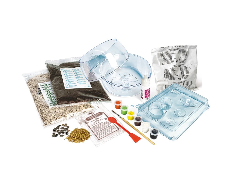 A fantastic kit for creating a personal miniature ecosystem with a truly magical setting, in perfect Harry Potter style! An activity that allows children to have fun while learning the importance of caring for plants. Contains plaster of Paris, molds, and tempera colors to create Hagrid's fantastic hut and, of course, pumpkins. Children can have fun using seeds, peat, soil, sand, and stones to grow a natural landscape full of plants around Hogwarts. A game that can be personalized and contains all the elements necessary to decorate the child's room.