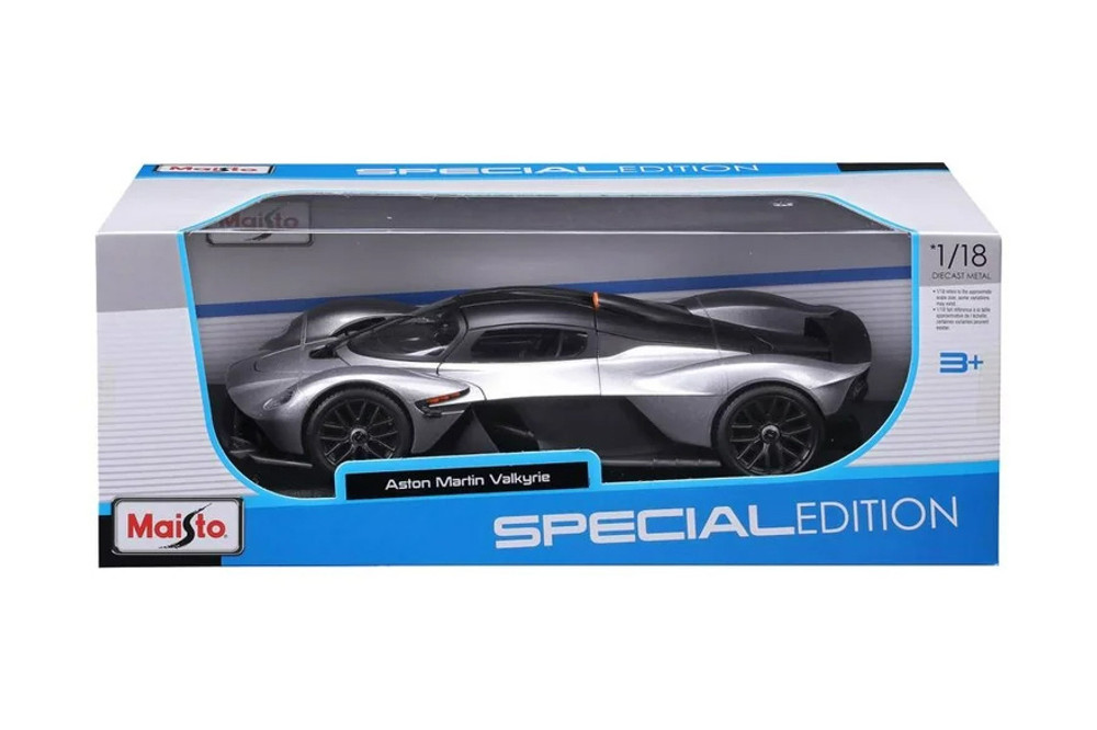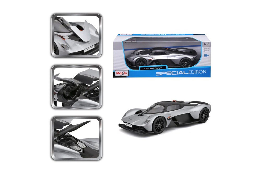 You'll be blown away by this cool sports car from Maisto! This 2022 Aston Martin Valkyrie is a 1/18 scale model replica. It comes in silver and features openable trunk, doors and engine compartment, freewheeling, detailed interior, exterior, engine compartment. It's an exceptional model for any sports car collection, and wonderful for unwavering Aston Martin fans!