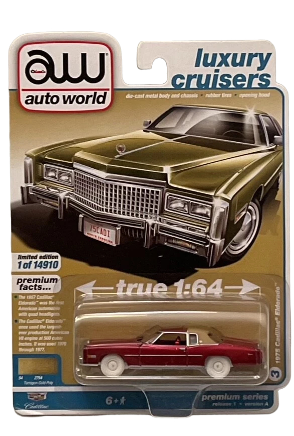 Don't miss out on this powerful muscle car from Auto World! This 1975 Cadillac Eldorado is a 1/64 scale model replica. It comes in gold and features real rubber tires, opening hood, detailed exterior, metal body and chassis, comes in a blister pack. It's a fantastic automobile for any muscle car collection, and ideal for avid Cadillac aficionados!