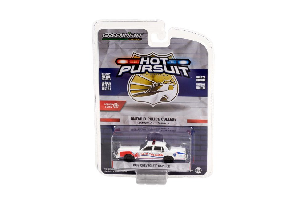 Every car lover dreams about this legendary police car from Greenlight! This Ontario Police College 1987 Chevrolet Caprice Skid Training Car is a 1/64 scale model replica. It comes in white and features real rubber tires, detailed exterior, metal body and chassis, comes in a blister pack. It's a superb item for any police car collection, and a real gem for devoted Chevrolet enthusiasts!