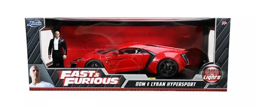 FAST AND FURIOUS - LYKAN HYPERSPORT, RED WITH DOM FIGURE AND LIGHTS - 1/18