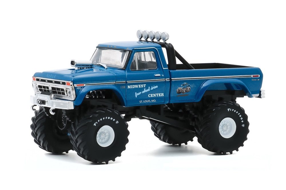 Don't miss out on this exceptional monster truck from Greenlight! This 1974 Ford F-250 Monster Truck is a 1/43 scale model replica. It comes in blue and features real rubber tires, metal body and chassis, detailed exterior, car does not have openings. It's a superb item for any monster truck collection, and a real gem for fervent Midwest Four Wheel Drive & Performance Center enthusiasts!