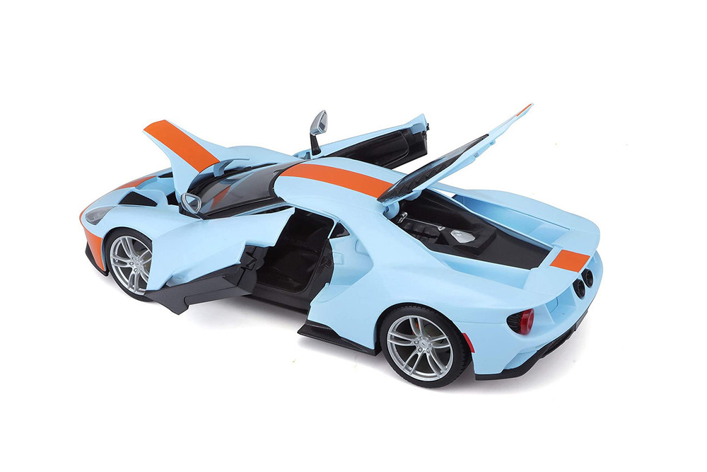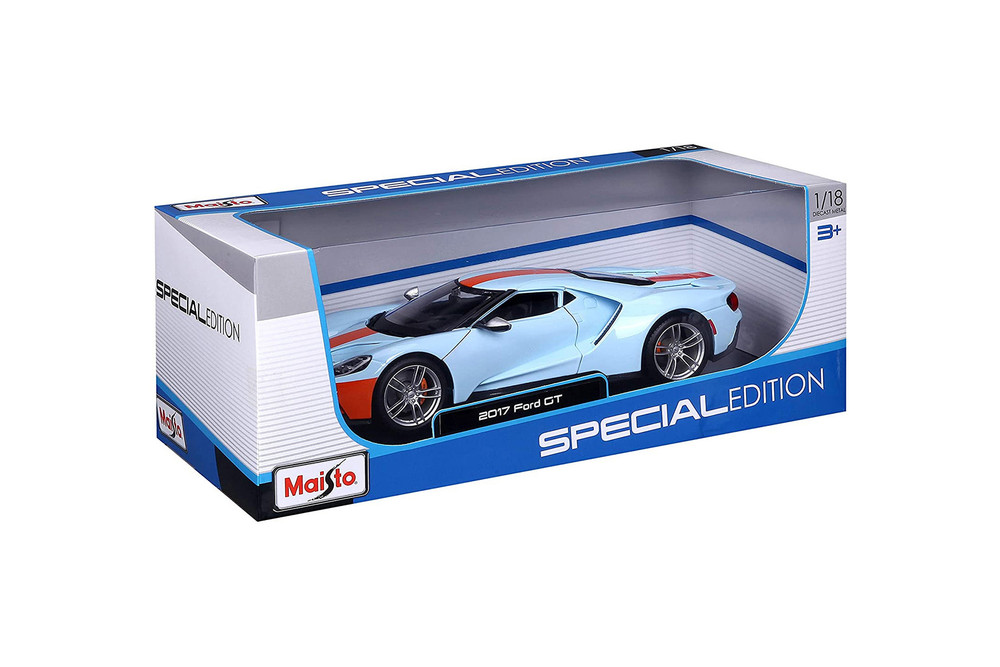 Make an impression with this limitless modern muscle car from Maisto! This 2019 Ford GT is a 1/18 scale diecast model replica. It comes in blue and features an die-cast metal body with openable doors, hood and trunk, full function steering, four wheel suspension and detailed chassis. It's a great item for any modern muscle car collection, and perfect for fervent Ford aficionados!