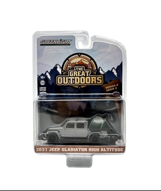 Check out this cool pickup truck from Greenlight! This 2021 Jeep Gladiator High Altitude Pickup w/ Bed Tent is a 1/64 scale model replica. It comes in black and features real rubber tires, detailed exterior, metal body and chassis, comes in a blister pack. It's an outstanding piece for any pickup truck collection, and just right for fervent Jeep fanatics!