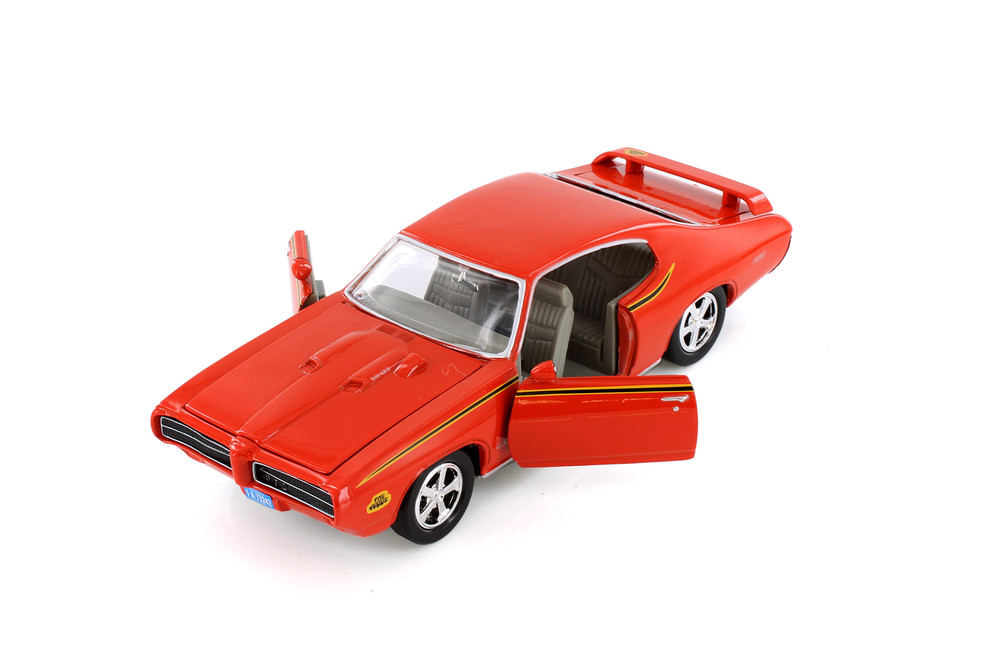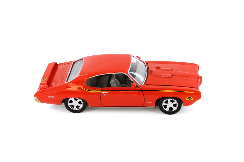 Every car lover dreams about this authentic muscle car from Showcasts! This 1969 Pontiac GTO Judge Hardtop is a 1/24 scale model replica. It comes in orange and features openable doors, hood and trunk, and workable steering. It's a superb model for any muscle car collection, and a real gem for loyal Pontiac enthusiasts!