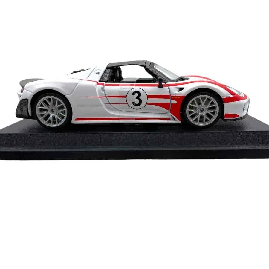 Check out this slick race car from the After 2000. This Porsche 918 Weissach Race Car #3 is a 1/24 scale diecast model replica. It comes in white and features openable doors. It's a brilliant addition for any race car collection, and perfect for die-hard Porsche aficionados!