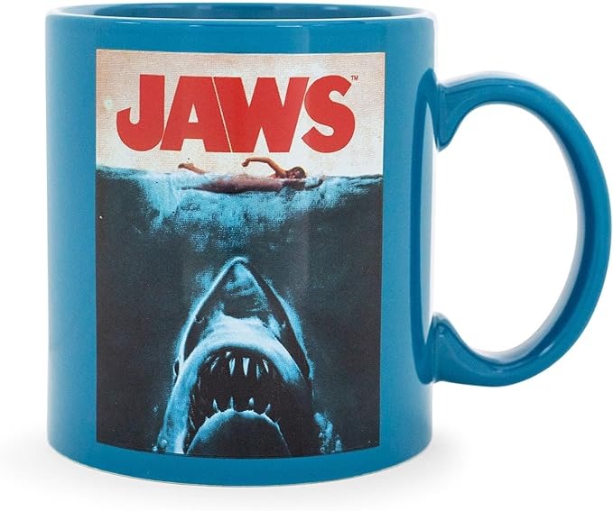 Dive into cinematic nostalgia with this exclusive JAWS coffee mug! Inspired by Steven Spielberg’s iconic shark thriller, this officially licensed ceramic mug features the legendary movie poster artwork — a massive great white shark rising toward an unsuspecting swimmer, instantly evoking the suspenseful theme music that made audiences fear the ocean. The reverse side features a nod to Amity Island, the quiet beach town forever changed by a single shark attack.