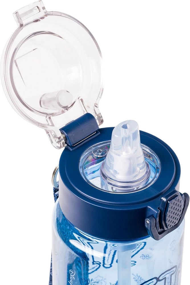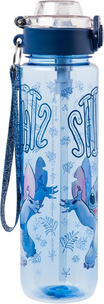 - DISNEY LILO AND STITCH WATER BOTTLE: the Front of Lilo and Stitch water bottle features Stitch with his arms raised. Written above Stitch is his name. The background of the water bottle is blue with illustrations of leaves and flowers.
